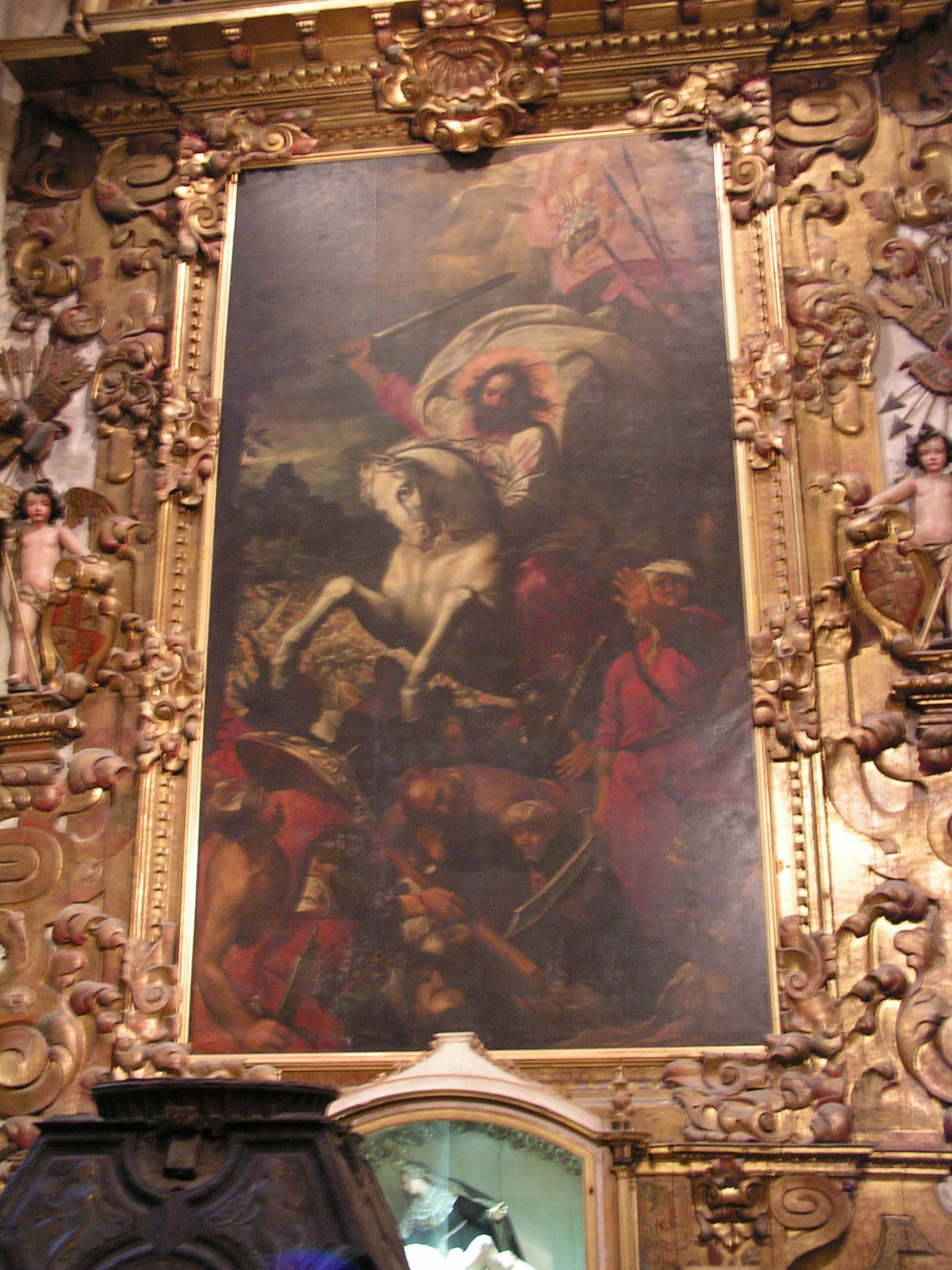 Por último, la Catedral de Sevilla, que, como no podía ser menos, cuenta con numerosas representaciones iconográficas y pictóricas del Apóstol, y con Capilla propia de Santiago, presidida por la hermosa pintura de la Batalla de Clavijo, de Juan de Roelas (1609) y en la que destaca el sepulcro del Cardenal Gonzalo de Mena y Roelas, fallecido en 1401, que fue fundador, apenas un año antes de su óbito, de la Hermandad de los Negritos (formada por esclavos y libertos), la más antigua de Sevilla.