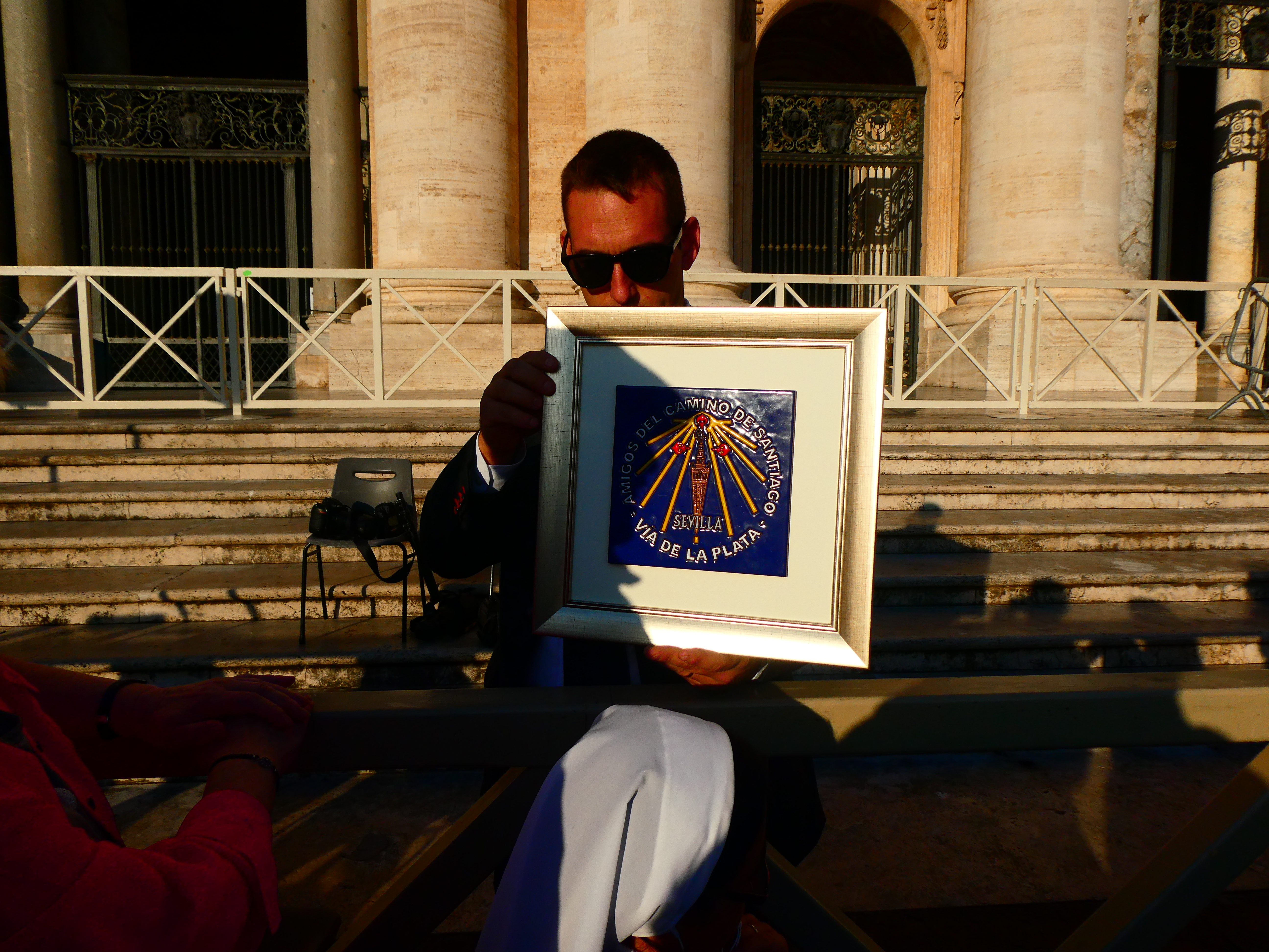 El Papa Francisco parece más frágil en las distancias cortas; el peso del cargo se trasluce en sus ademanes y movimientos, y, sin embargo, su eterna sonrisa, y esa luz que refleja su figura, suavizan cualquier tensión o preocupación a su alrededor e infunde un sentimiento de alegría irreprimible. Bonito recuerdo el que nos llevamos, aunque no podamos entregarle el presente en mano; con posterioridad, en la Navidad, una felicitación de la Santa Sede, que incluye un agradecimiento por el presente, llegará a nuestra sede social para nuestra tranquilidad y regocijo.