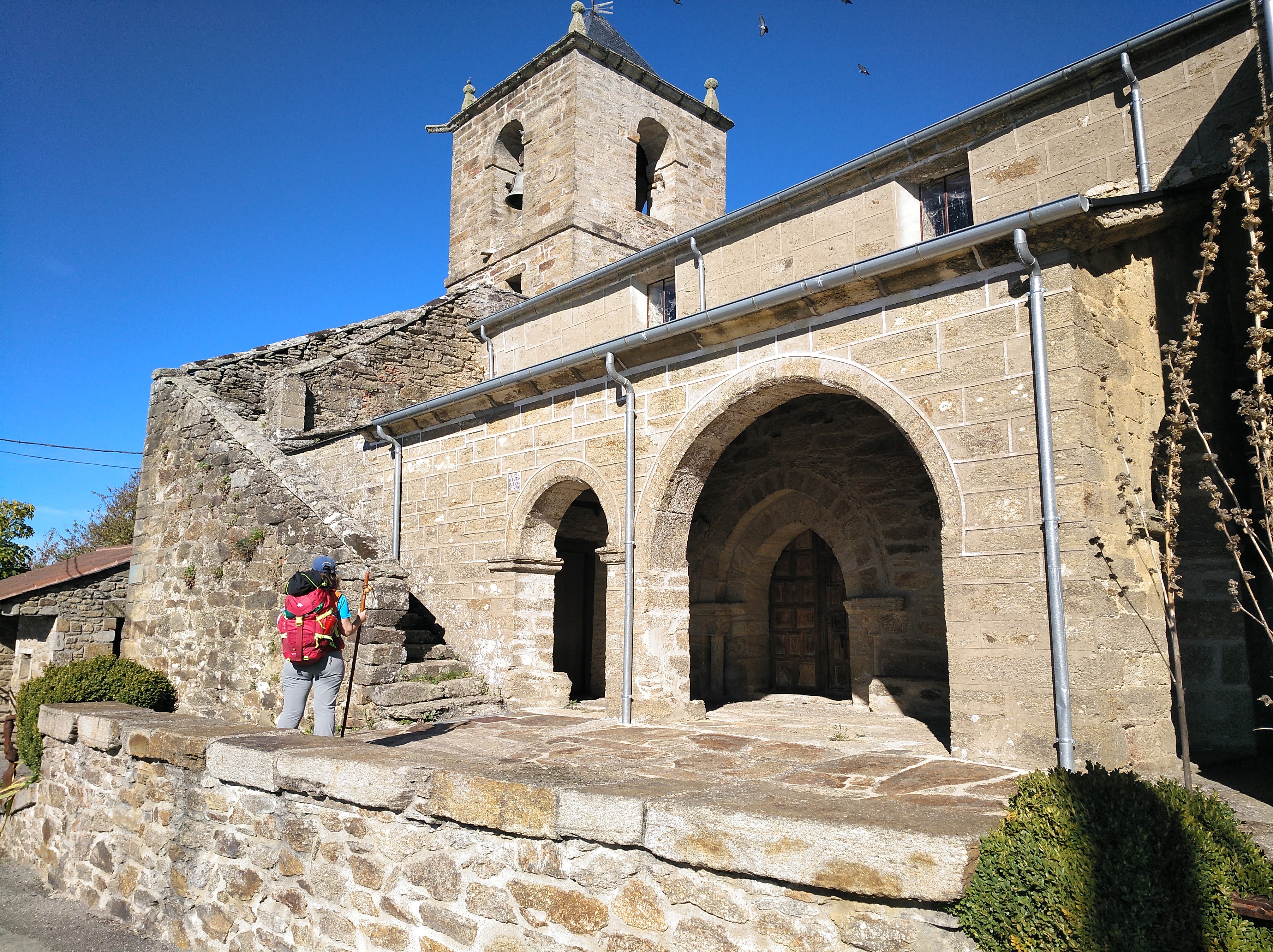 La mañana trajo algo de lluvia y viento fresco de las montañas, que serenó el ambiente mientras nos encaminábamos hacia La Fuente y su preciosa (y cerrada en pleno Año Santo…) Iglesia de Santa Juliana. Una senda ascendente nos conduce al Collado de Hoz mientras el cielo amenazaba tormenta. Dura la subida con un paisaje digno de un cuadro el que iba quedando a nuestras espaldas. Y en lo más alto, una pequeña cabaña muestra en su puerta a Rosa, una anciana que trabaja cuencos y utensilios de cocina con sus propias manos y una oxidada navaja: el peregrino, reacio a cargar con cualquier cosa que le aporte peso, no se puede resistir sin embargo ante su dedicación, a comprarle algo y echar unos minutos de charla sobre lo divino y lo humano, obteniendo además como recompensa un buen puñado de nueces…es la intrahistoria del Camino que podemos encontrarnos si abrimos los sentidos y encerramos las prisas en un cajón.