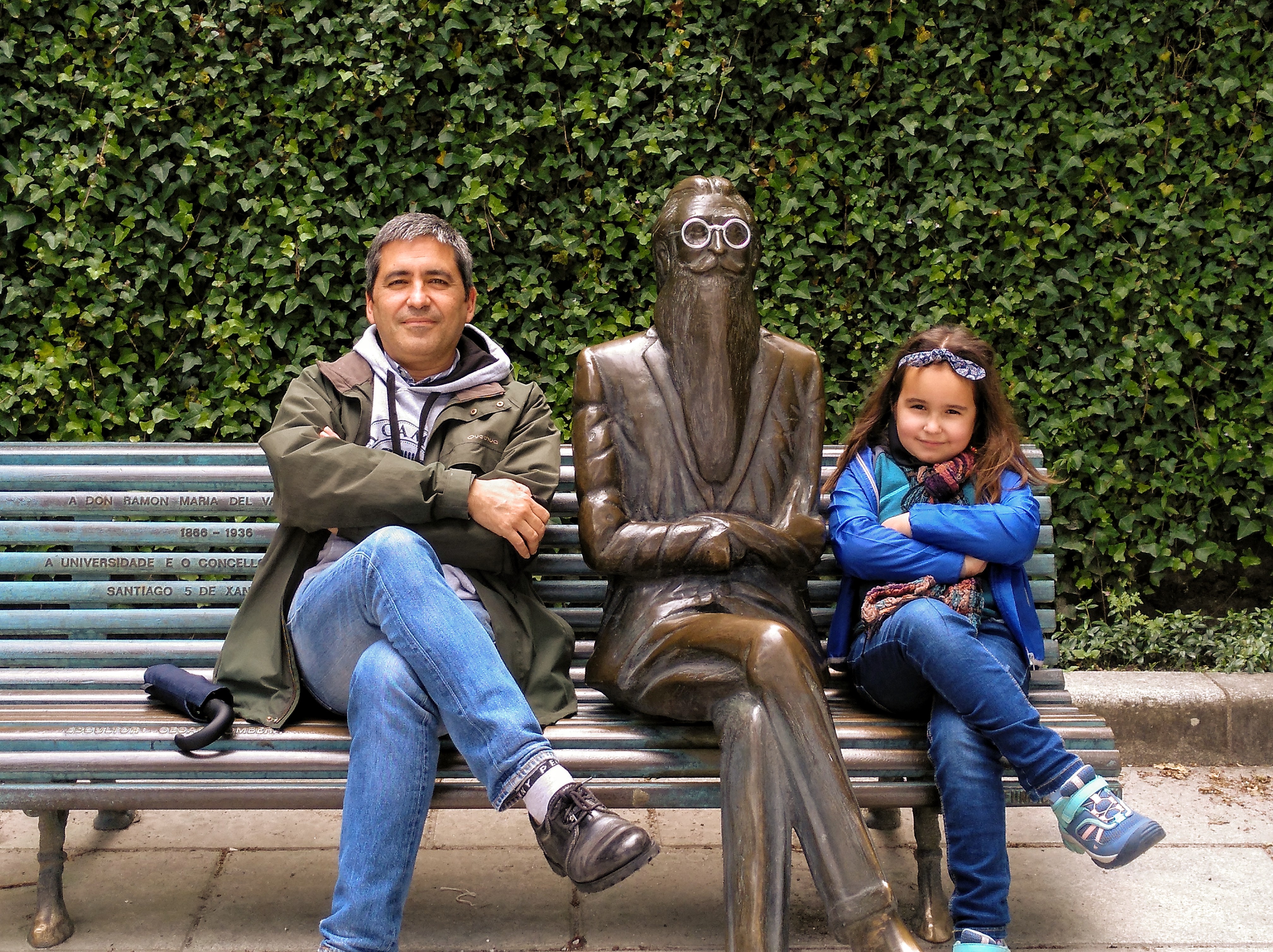 El mundo andaba cansado esos días, cual peregrino al final de la etapa, y una mezcla de sosiego tras la tormenta y recelo ante un cielo aún incierto lo impregnaba todo. El tiempo era escaso para acudir a Santiago y coincidir con alguna de las tres festividades del Santo, y la ilusión de mostrar ese legado a los suyos complicaba el viaje…pero Santiago siempre pone la mano. Los pasajes de avión llegaron, los permisos escolares para la pequeña, el alojamiento, ideal para la ocasión en el alma de la ciudad antigua, al final de la vieja cuesta que sube desde S. Francisco, al calor familiar de la hospitalaria casona que alberga el bosque doméstico y los duendes de bronce que la protegen…Y así llegaron los días de mayo, que junto con el otoño, son sus preferidos.
